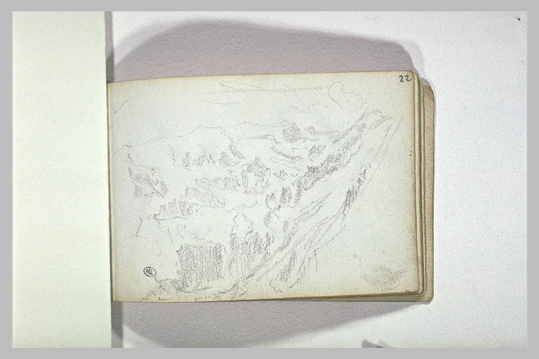 Album Andrieu Pierre -4-, folio 22, dessiné au recto ; Carnet cartonné, anciennement classé à Delacroix, comportant le cachet E. D. sur plusieurs folios. Croquis d'animaux, de paysages de montagne et de personnages. H. 0,091 ; L. 0,137