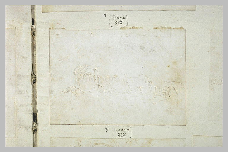 Album Della Bella Stefano, folio 7, rapporté au recto ; Album cartonné recouvert de papier brun marbré. Il porte sur le plat une étiquette avec la mention suivante :Stefano della Bella, et sur le dos, une autre, annoté :vol. I. Ce volume est paginé de I à 126, chacun des soixante-trois feuillets qui le composent portant un numéro au recto et au verso. Les dessins sont collés, soit en plein, soit par un onglet sur le feuillet de l'album. H : 0,460 ; L : 0,365. ; Plume et encre brune