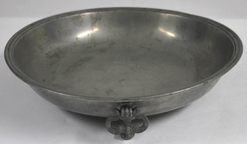 les pieds sont moulés et le plat a été formé avec la technique de l'emboutissage ; Plat creux doté d'anses latérales. Deux anses mobiles. Trois petits pieds galbés