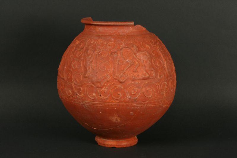 Vase de Mithra est une oeuvre de céramique, gallo-romain, croyances - coutumes, archéologie, visible au musée de céramique gallo-romaine. L'oeuvre a été exécutée en terre cuite (tourné, estampé, sigillée, barbotine). Dimensions : H. 257mm, D. 230mm, P. 1575g. Le thème de l'oeuvre est : scène mythologique (divinité, Mithra, bonnet phrygien, abondance, corne d'abondance, patère, personnage, torche, satyre, flûte de Pan, animal),ornement à forme végétale (arbre, feuillage, rinceau, stylisé). Elle est datée de la 4e quart 4e siècle.