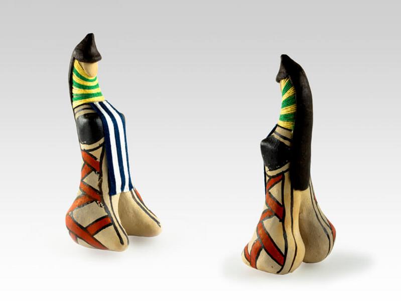 Jocondeの備考欄によると、 Iny Karaja Population の作品には以下の技法・素材が使われています: argile (modelé), teinture, fibre végétale, calebasse, argile (modelé), teinture, perle de verre, argile (modelé), teinture。各作品の詳細ページには、「素材/技法」欄に技法が記載されています。
