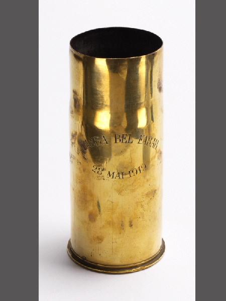 Métal jaune (douille d'obus) travaillée ; Vase cylindrique avec inscription gravée et références au cul.