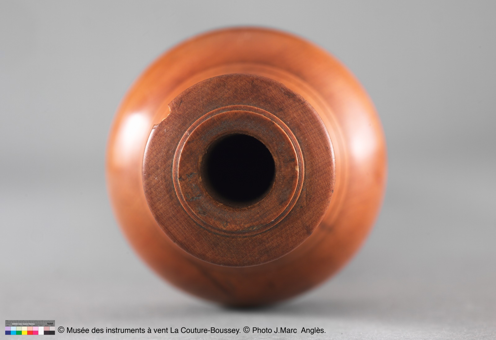 Flageolet en forme de flûte traversière PICARD Vincent, JULLIOT Napoléon et CHÉDEVILLE-BELLEMÈRE Jacques François ? Fin du XIXe siècle La Couture-Boussey Inv. 110 Pièce d'insufflation, tête, corps du haut, corps du bas et patte en buis, 4 bagues en corne, 2 clefs carrées plates en laiton montées sur bloc, 6 trous de jeu, 1 trou de pouce. Estampille "(dans un losange en tiret) MUSÉE / COUTURE-BOUSSEY / EURE" sur la tête, le corps du haut, le corps du bas et la patte, marquage "110" sur la tête. Cet instrument est singulier : il est doté d'une tête de flageolet et d'un corps de flûte traversière. Il pourrait s'agir d'un instrument expérimental. D'après les archives du Musée, le bois a probablement été offert par Jérôme THIBOUVILLE, et l'instrument a dû être fabriqué par Vincent PICARD, Napoléon JULLIOT et Jacques François CHÉDEVILLE-BELLEMÈRE.