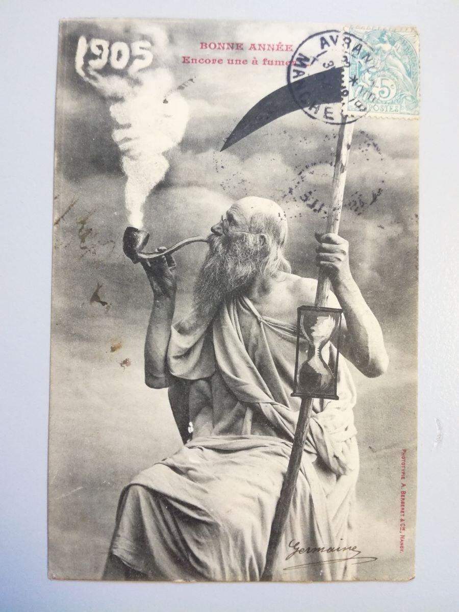 Un homme barbu en toge (Chronos) tient de sa main gauche une faux dont le manche est orné d'un sablier. De sa main droite, il fume une pipe dont la fumée écrit 1905 dans le ciel.