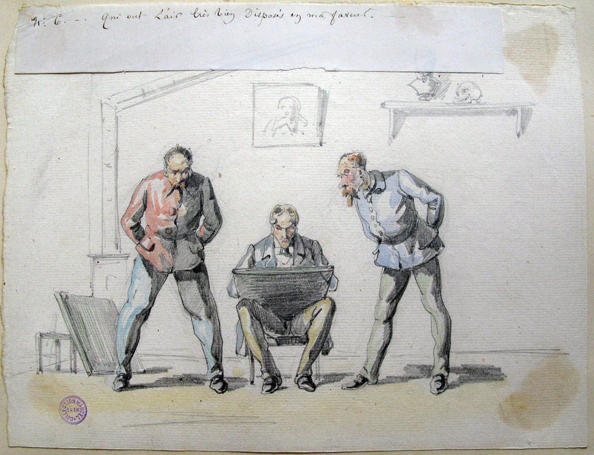 Le musée des beaux-arts conserve 6. Qui ont l'air très bien disposés en ma faveur ; Les tribulations d'un apprenti peintre (titre factice de la série), oeuvre de Le Pippre Septime (1833-1871). Le Pippre Septime (1833-1871) a utilisé ici papier (dessin à l'encre, aquarelle). Les dimensions de l'oeuvre sont : Hauteur en cm 18 ; Largeur en cm 22,5. Cette pièce remonte à la 19e siècle. À propos de cette pièce : Montfort-l'Amaury, 1833 ; Le Mans, 1871.
