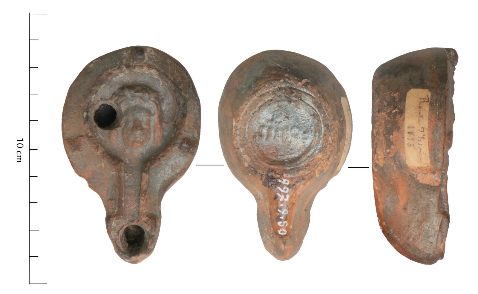 Loeschcke X a. Firmalampen moulée sans anse. Réservoir circulaire de profil biconvexe. Bandeau penché vers l'extérieur portant trois tenons rectangulaires non percés, sur l'axe horizontal. Disque en cuvette bordée par un bourrelet. Bec long au méplat en forme de pelle et ouvert sur le disque. Base circulaire plate limitée par deux sillons portant la marque "FORTIS" en relief. Bavures et bulles de surmoulage. 2e trou de remplissage et trous d'évent non forés. Traces d'utilisation.