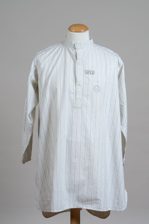 Chemise à rayures tennis bleu et blanc, gorge fermée, col droit, petits poignets droits, hirondelles, coutures rabattues. Tampon d'identification devant gauche : " 131e Régiment d'Infanterie, Biebuyck, Lille, 1933 ".