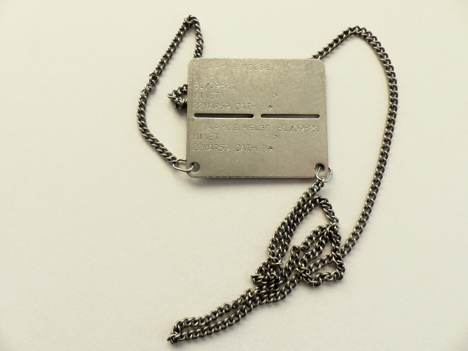 Plaque en métal de forme rectangulaire aux coins arrondis, percée de deux trous circulaires dans le registre inférieur ; deux anneaux maintiennent une chaînette en métal ; deux fentes centrales divisent la plaque en deux parties ; l'une amovible est facilement récupérable (brisure) par une tierce personne au décès du soldat ; dans ce cas, celle-ci est intacte ; les deux registres de la plaque sont emboutis avec le nom, le rang, la compagnie, le régiment du porteur et une date. Ces informations permettent à l’office compétent d'établir un bilan des pertes même au cas où le corps n'aurait pu être récupéré.