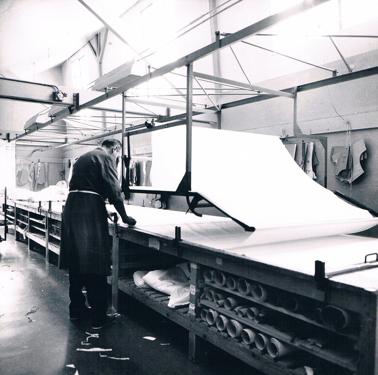 Atelier de coupe de la S.O.G.E.C., réalisation du matelas de tissu à l'aide d'un chariot plieur suspendu. Ce matelas est réalisé par Pierre Balgaite.