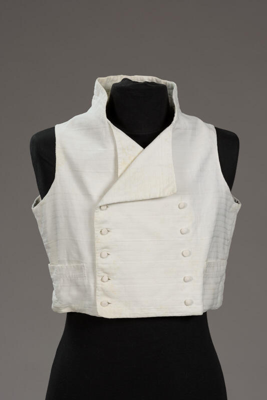 Gilet en piqué de coton blanc à rayures horizontales, col droit à grand revers, double boutonnage avec boutons recouverts (2 x 5 boutons), 2 poches gilet, doublure et dos en toile blanche, dos resserré par 2 cordons à nouer, 4 galons d'attache intérieur.