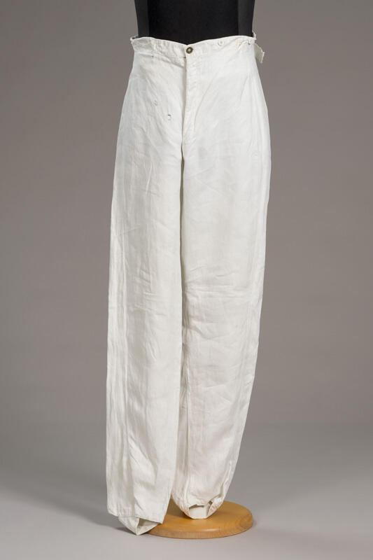 Pantalon d'homme en toile de coton blanc, braguette fermée par 7 boutons non assortis, sous-patte d'attache boutonnée par 3 boutons dont un manquant, poche gousset, 4 boutons cousus à la taille pour le port de bretelles, patte de serrage au dos (boucle manquante), sous-pieds, jambe arrière-droite réalisée en 3 morceaux.