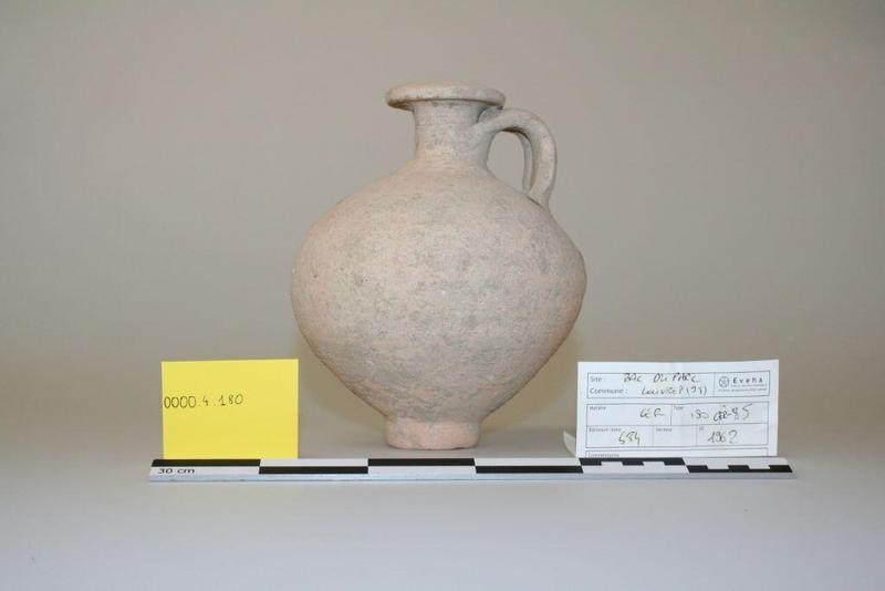 Cruche à lèvre plate à pâte (605) commune claire calcaire beige orangé.