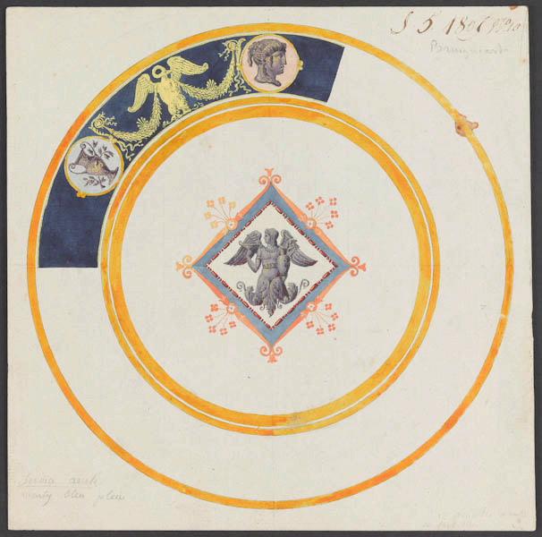 ornementation (assiette, frise, ornement, vase, aigle, guirlande),figure (tête, de profil, personnage, aile)