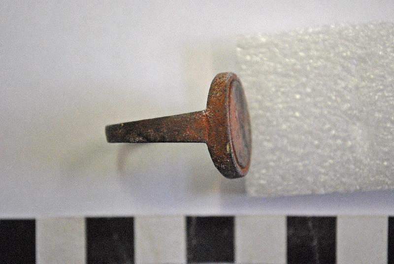 Intaille en cornaline (P) sertie sur bague de fer, 'tête masculine casquée de profil G; buste drapé.' Guiraud, cat. 90 ; 'Bel anneau, monture en fer avec chaton de 0,018 cornaline fendue, représentant un empereur, Titricus ??, épaule couverte du Paludamon. Diam. 0,02 Trouvé près la porte St-André.' Inventaire B. Bulliot