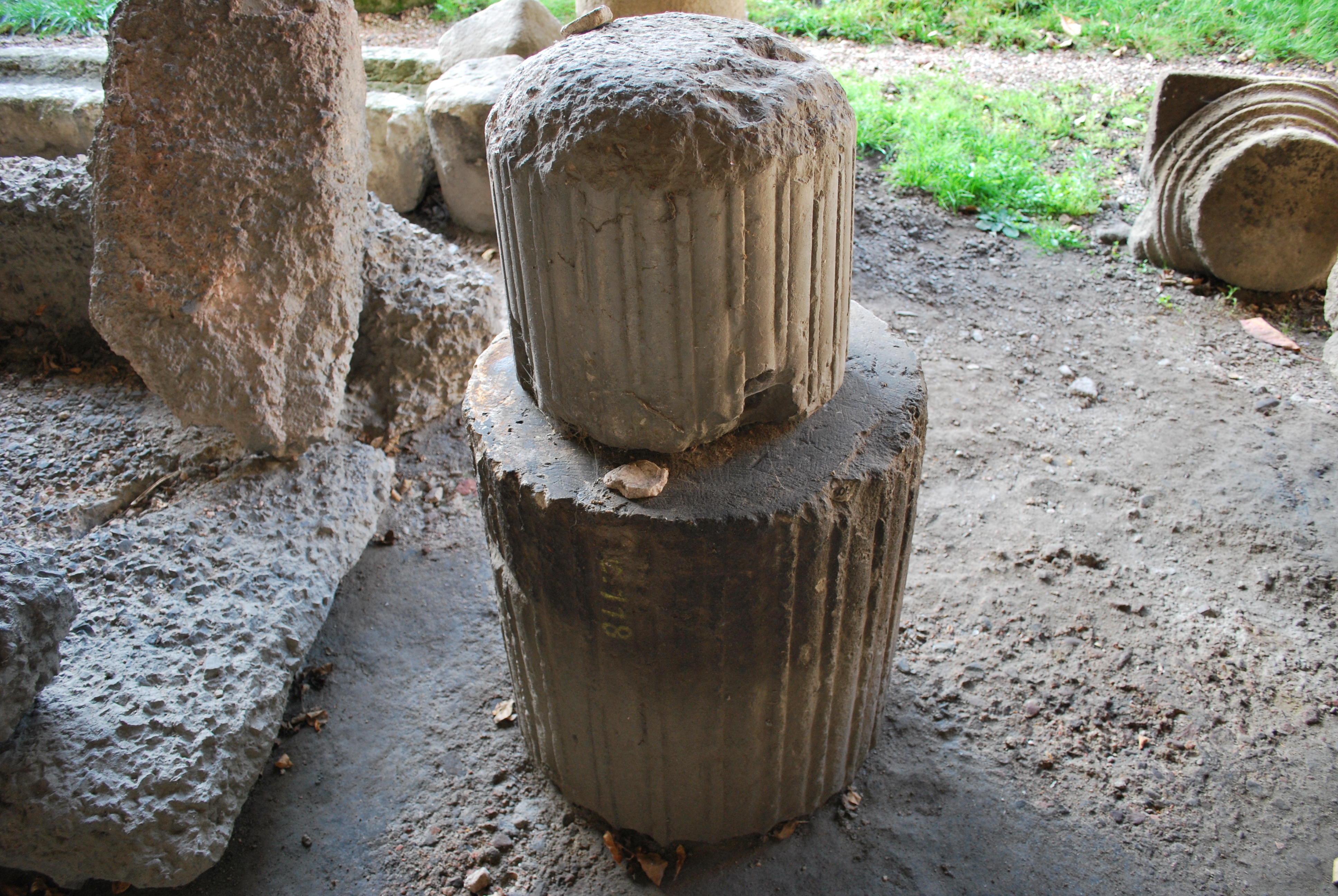Tambour de colonne rudentée en marbre rose ou Marmor Chium provenant de Chios, retaillée et au dessus aplani et rebords piqueté en 1/4 de rond, 24 rudentures.