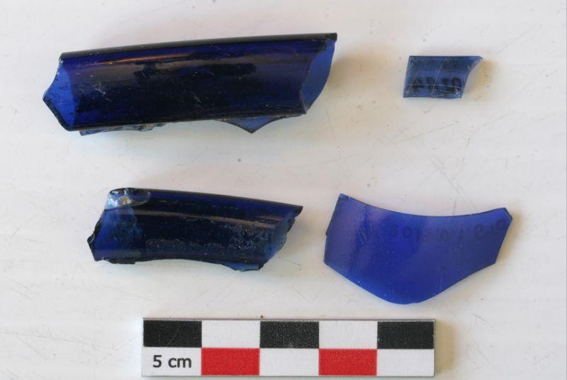 Incomplets. Seuls subsistent quatre fragments dont un fragment de rebord à lèvre éversée. Verre bleu cobalt, translucide.