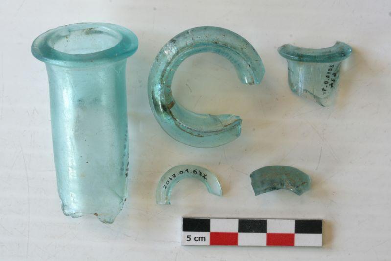 Incomplets. Seuls subsistent cinq fragments de goulots de flacons. Verre bleu turquoise, clair, translucide.