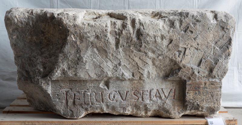 Calcaire taillé ; 'Première ligne d'une inscription gravée au-dessous d'une corniche, fruste ainsi que les pilastres qui la soutiennent.' (Julliot) 'Au dessous de la corniche de la face principale, on lit deux qualificatifs équivalents à rude et blond dont on a fait deux noms et constituant l'unique ligne restant de l'inscription : TETRICVS FLAVI. Les caractères, hauts de 0m06, sont d'une main peu habile, et on peut remarquer que les T sont faits d'un I vertical et d'un autre I couché au-dessus.' (Julliot)