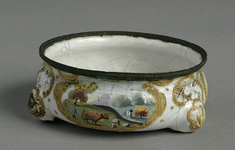 Cette œuvre relève du domaine : émaillerie, vie domestique. Elle a été réalisée avec les matériaux et techniques suivants : émail, peint, cuivre. Sa période de création est identifiée comme : 18e siècle.