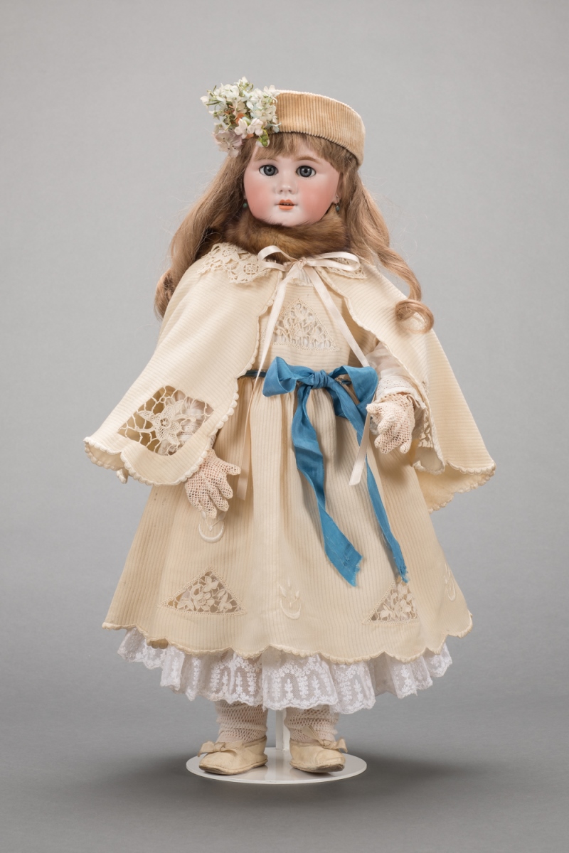 composition ; Poupée de la marque SFBJ, la tête en biscuit est marquée Simon & Halbig taille 11 et corps en composition d’origine. Bouche ouverte et perruque ancienne sur une calotte neuve. Elle a été donnée au musée du Jouet avec un trousseau complet de la même période. Très bon état général. Le musée du Jouet ne conservait pas encore de Poupée SFBJ de ce modèle en si bon état. La société SFBJ fait suite à la société Jumeau à la fin du XIXe siècle et au début du XXe siècle. Cette poupée illustre les évolutions des poupées à cette époque.