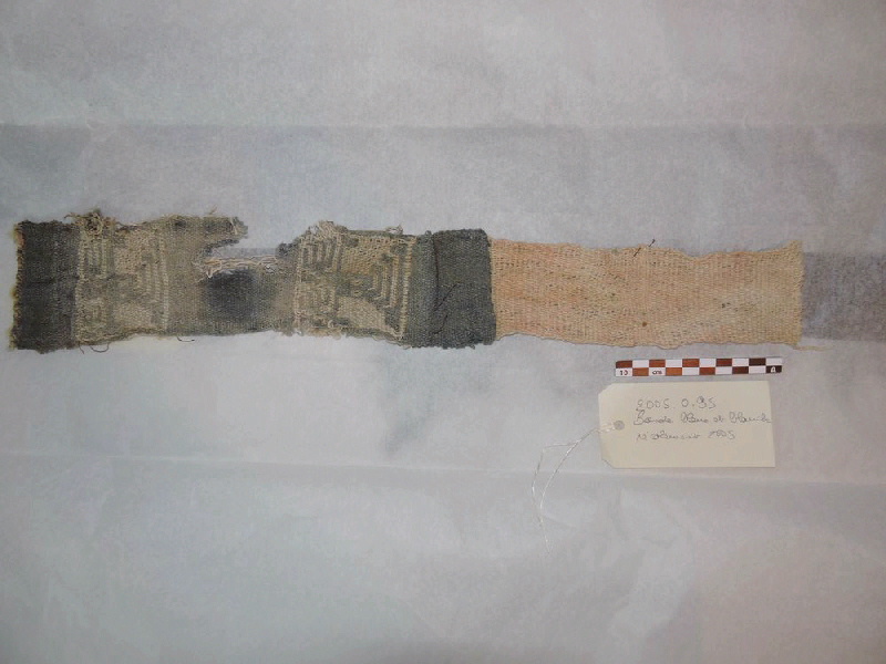 Cette pièce est en fil, tissage. Mesures : Hauteur en cm 48 ; Largeur en cm 8 ; Profondeur en cm 0.5 ; Poids en kg. 0.009. Cette pièce remonte à la 2e moitié 14e siècle;15e siècle.