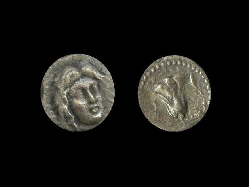 avers,figure mythologique (Hélios, tête),revers,représentation animalière (rose, galère, grènetis)