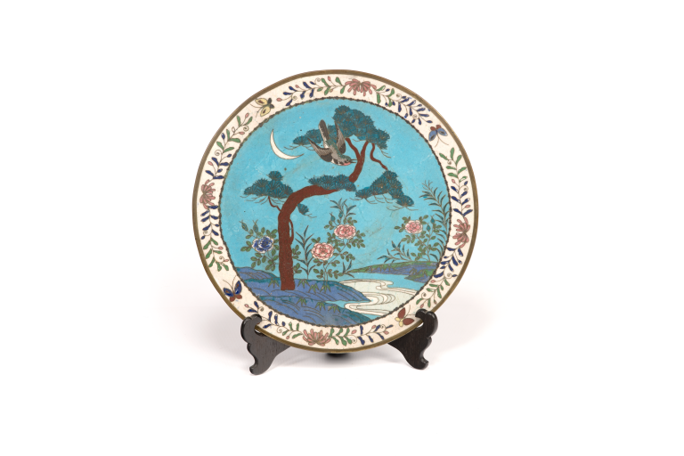 Plat circulaire à pied annulaire, à décor polychrome d'émaux cloisonnés (scène de paysage centrale).#Après le travail de la pièce de cuivre par martelage et soudure, et le traçage du motif souhaité, de minces fils de cuivre sont courbés puis collés ou soudés sur la pièce qui est chauffée à 1200°C. Les cloisons constituées sont remplies d'émaux, cuits à 1000°C. Les émaux se rétractant à la cuisson, il est parfois nécessaire de renouveler l'opération. La pièce est ensuite polie à l’aide de pierres, comme l’émeri, ou de carbone.#Très bon état.