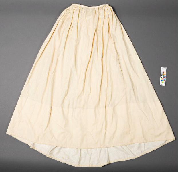 Jupe ou jupon en lainage façonné fond sergé écru entièrement froncé à la taille. L'étoffe de laine et la présence de coutures à la machine à coudre indiquent une datation les années 1930-1950
