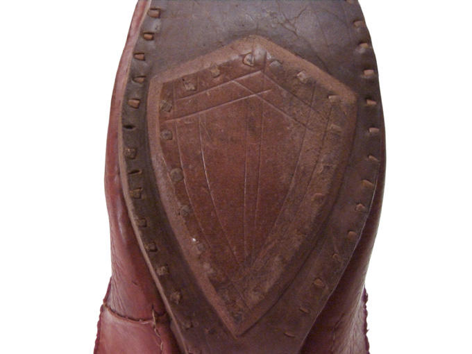 Cette œuvre relève du domaine : costume - accessoires du costume, Asie méridionale, ethnologie. Elle a été réalisée avec les matériaux et techniques suivants : cuir. Sa période de création est identifiée comme : 1er quart 20e siècle.