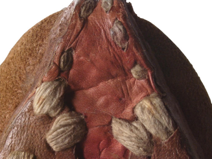 Cette œuvre relève du domaine : costume - accessoires du costume, Asie méridionale, ethnologie. Elle a été réalisée avec les matériaux et techniques suivants : cuir, velours. Sa période de création est identifiée comme : 1er quart 20e siècle.