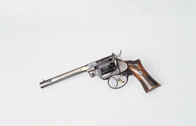 Revolver à percussion sur capsules, système Loron, Versailles (France) vers 1860 (Loron Pierre-Antoine, armurier à Versailles en 1843. Brevet français en 1850 pour un pistolet de salon. 11 brevets belges de 1855 à 1880). Arme bronzée, canon octogonal rayé, guidon fixé à queue d'aronde. Le canon porte sur le côté gauche le poinçon ' U ' couronné, en dessous ' V ' couronné, '96 ' et ' LORON &.C. '. Le canon se démonte à l'aide d'une clef fixée sur le côté droit. Elle se replie le long de la partie inférieure de la carcasse (sous le barillet). Sur le côté gauche vient se caler la poignée servant à actionner le chargement de la munition dans la chambre du barillet. Barillet (démontable) à 5 chambres, il est gravé de rinceaux d'acanthe, à l'arrière on y trouve vissées les 5 cheminées. Sur la tranche avant du barillet, poinçon ' M ' couronné. Carcasse fermée. Plaquettes de crosse en noyer, le cadre est gravé à l'arrière d'entrelacs et de rinceaux. Pontet en fer bronzé gravé de rinceaux d'acanthe. Système à double action