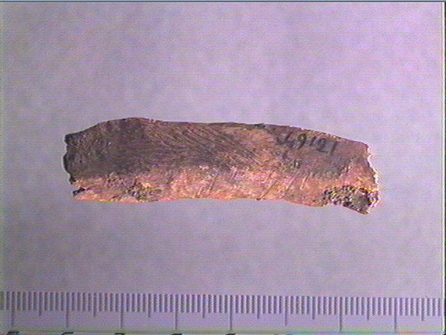 La réalisation fait appel à os, gravé. Elle mesure L. 5.8 ; La. 1.4 ; E. 0.6. On y reconnaît : ornement (chevron).