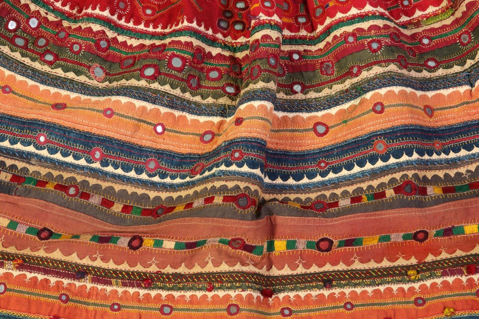 Jupe en toile de coton à broderies colorées et application de miroirs.