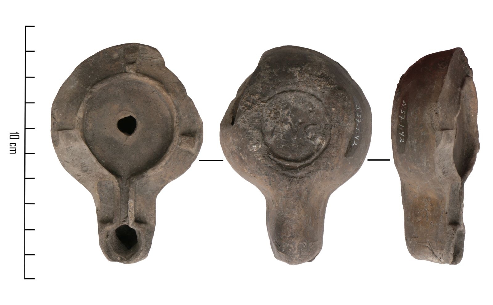 Loeschcke X a. Firmalampen moulée sans anse. Réservoir circulaire de profil biconvexe. Bandeau penché vers l'extérieur portant trois tenons rectangulaires non percés, sur l'axe horizontal. Disque en cuvette bordée par un bourrelet ouvert sur le bec au méplat en forme de pelle. Base circulaire en creux, limitée par deux anneaux concentriques enfermant la marque "AVG" en relief. Trou de remplissage central.