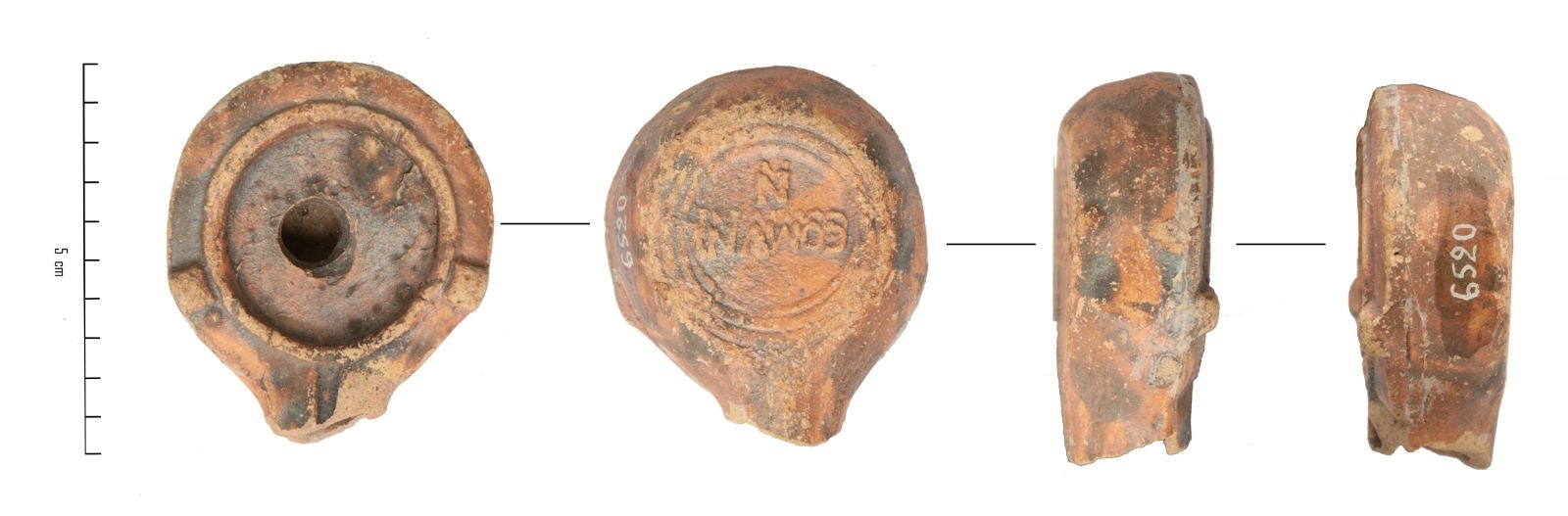 Loeschcke IX b. Firmalampen moulée sans anse. Réservoir circulaire de profil biconvexe. Bandeau penché vers l'extérieur portant deux tenons rectangulaires non percés, sur l'axe horizontal. Disque en cuvette bordée par un bourrelet. Le bec est manquant mais le départ encore existant comporte un dessus biseauté avec un sillon. Base circulaire plate limitée par trois anneaux concentriques enfermant la marque en relief "COMVNI N" apposée deux fois. Bavures d'argile dûes à un surmoulage.