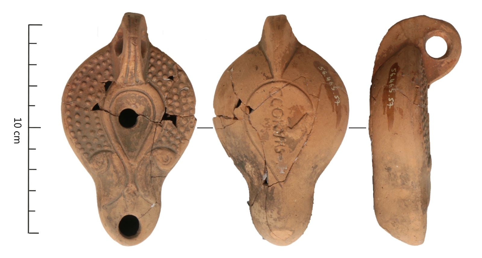 Fabbricotti Ia ; Walters 68. Lampe piriforme à bec arrondi et à anse verticale percée à deux sillons sur la tranche. Bandeau penché vers l’extérieur, terminée par deux volutes simples. Médaillon concave avec un trou de remplissage central. Base en amande plate, limitée par un sillon enfermant la marque de potier en creux "CCORVRS".