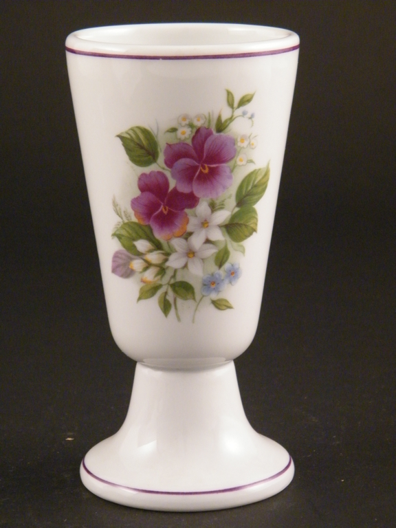 Mazagran à pied, motif de fleurs sur fond blanc, liseré violine sur le bord.