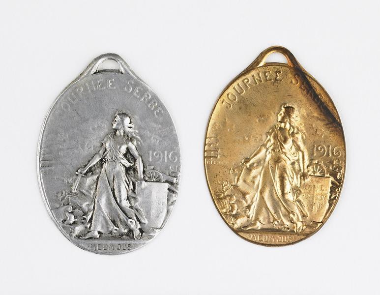 Lot de deux médailles commémoratives de la Journée Serbe de 1916. De forme ovale, l'une en aluminium et l'autre en laiton, elles représentent une figure allégorique.
