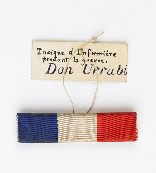 Insigne à épingle, représentant les couleurs du drapeau national français avec du fil de soie cousu sur un support en métal de forme rectangulaire. Barrette de décoration militaire, peut être celle de l'engagé volontaire (avant 1914?). De forme rectangulaire, elle est constituée d'un tissu en soie recouvrant une plaque de fer. Verte au centre et jaune sur les deux extrémités.