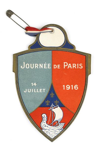 Insigne en papier cartonné en forme d'écusson sur lequel est accroché un ruban tricolore et une épingle à nourrice.