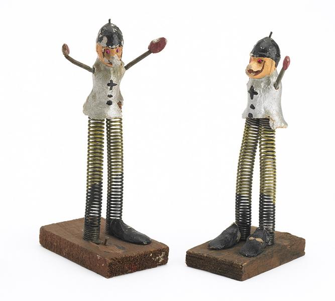 Deux pantins en plâtre montés sur ressorts (pour les bras et les jambes) fixés à des socles en bois.