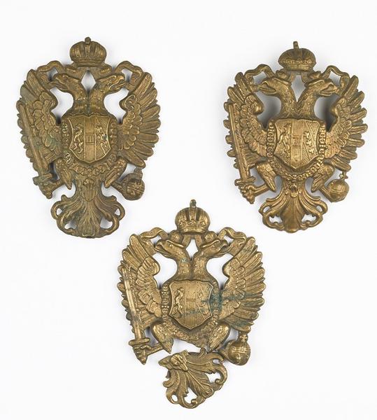 Trois insignes identiques en métal doré. Elles sont pourvues de deux boucles métalliques, sur le revers.