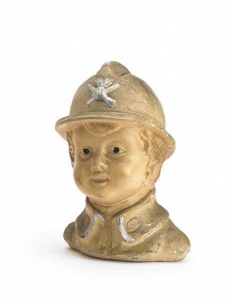 Cette oeuvre est réalisée en plâtre (peint). Dimensions de l'oeuvre : L. 12 cm ; l. 11.5 cm ; H. 17 cm ; VOLUM. 0,0023. Cette pièce a pour sujet : Première Guerre mondiale,représentation humaine (enfant),armement (grenade,canon),arme défensive (casque),décoration. L'oeuvre date de la 1er quart 20e siècle.