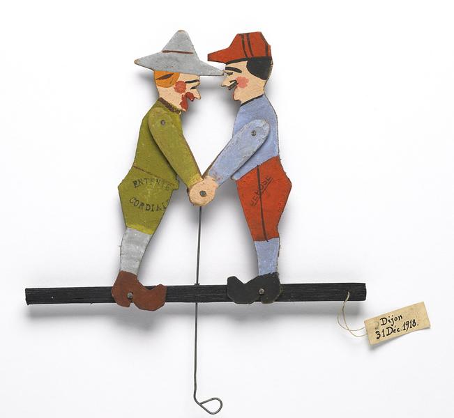Il s'agit d'une oeuvre en carton, bois, fer. Dimensions de l'oeuvre : l. 15.4 cm ; H. 16.4 cm ; E. 1.5 cm ; VOLUM. 0,0004 (pantin articulé) ; l. 15.4 cm ; H. 13.7 cm ; E. 1.5 cm ; VOLUM. 0,0003 (pantin non articulé). Elle figure : représentation humaine (homme,soldat),Première Guerre mondiale. L'oeuvre date de la 1er quart 20e siècle.