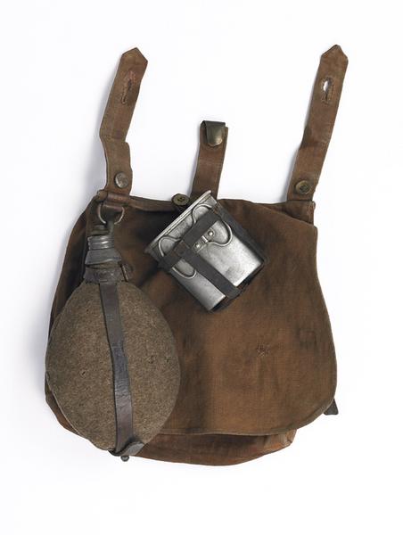 Sac en toile en forme de besace de couleur marron. Le sac comprend trois poches intérieures. Le rabat se ferme grâce à deux boutons en métal. A l'intérieur du rabat sont cousues deux lanières en cuir. A l'intérieur du sac est cousue une lanière en cuir comprenant trois encoches. Sur le dessus du sac sont cousues trois lanières en tissu (deux grandes et une petite munie d'un crochet). Une gourde (feldflashe) en métal recouverte de tissu vert est fixée sur le rabat grâce à une attache en métal ainsi qu'un quart modèle 1893 en aluminium embouti de section ovale fixé grâce à des attaches en cuir. Il est muni de deux anses repliables, également en aluminium, fixées à l'arrière du quart par une plaque rivetée.