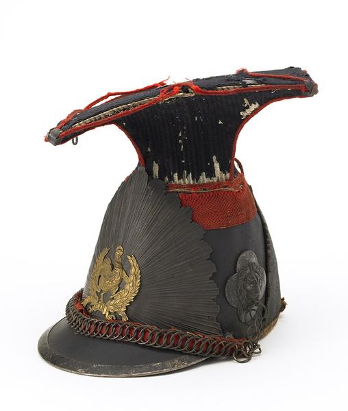 Czapska français (garde nationale, modèle 1830?) en cuir noir verni. Constitué de quatre parties : la visière, la bombe, le galon (bande de tissu rouge au dessus de la bombe) et le pavillon (partie supérieure de forme carrée). La visière est en cuir noir et peinte en vert sur le dessous, protégée sur le pourtour par du métal. La bombe tient sur la tête grâce à une bande de cuir réglable et une seconde couche de tissu réglable également. Présence d'une plaque frontale en cuivre représentant un fond rayonnant avec un coq gaulois posé sur deux branches de laurier nouées par un ruban. Jugulaire (chaînette) en cuivre couverte de tissu rouge et fixée de chaque côté du chapeau par les attaches - jugulaires représentant une tête de lion. Le pavillon, en carton, est recouvert de tissu bleu marine avec passepoil rouge, gaufré sur le dessous. Manque le plumet ou pompon en haut à gauche. Sur le coté droit, présence d'un crochet permettant d'accrocher la jugulaire, amovible du coté droit, d'une autre façon. Coins du pavillon protégés par des pièces métalliques en forme de fleur. Coin arrière orné d'un anneau.
