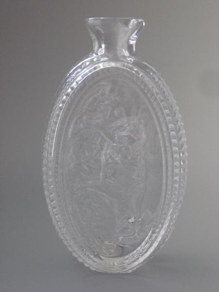 bouteille bombée de forme ovale ; goulot légèrement évasé ; cul de bouteille coupé pour pouvoir la maintenir debout ; décor moulé ; pourtour à décor dentelé