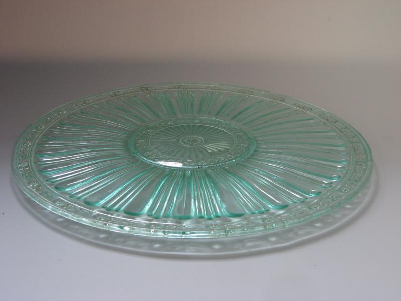 La réalisation fait appel à verre d'urane (moulé, pressé). Ses dimensions sont H. 0,7 cm, D. 31,3 cm. On y reconnaît : ornement à forme végétale (fleur, feuille),ornement à forme géométrique (strie, bambou). L'oeuvre appartient à la 1er quart 20e siècle.