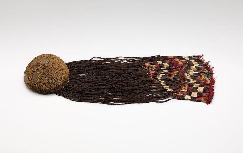 perruque composée de grandes tresse de cheveux fixées à un bonnet de laine de camélidé réalisé au crochet ou au tricot. Les tresses de cheveux bruns placées à l'arrière du bonnet, présentent deux registres décoratifs de deux hauteurs différentes. Les plus longues sont à l'intérieur, les plus courtes à l'extérieur. La base de ces tresses est décorée de fins fils de laine polychrome entourant la tresse, regroupés par registres de couleurs d'une longueur de 2,5 cm environ. La décoration s'étend sur 16 cm environ.