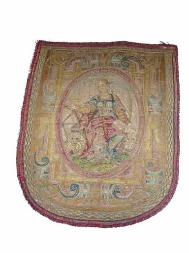 Il s'agit d'une oeuvre en jute, toile (brodé), fil de soie, fil d'argent. Ses dimensions sont H. 59 ; l. 49.5. Le motif représenté : figure (sainte Catherine d'Alexandrie). L'oeuvre date de la 1er quart 17e siècle.